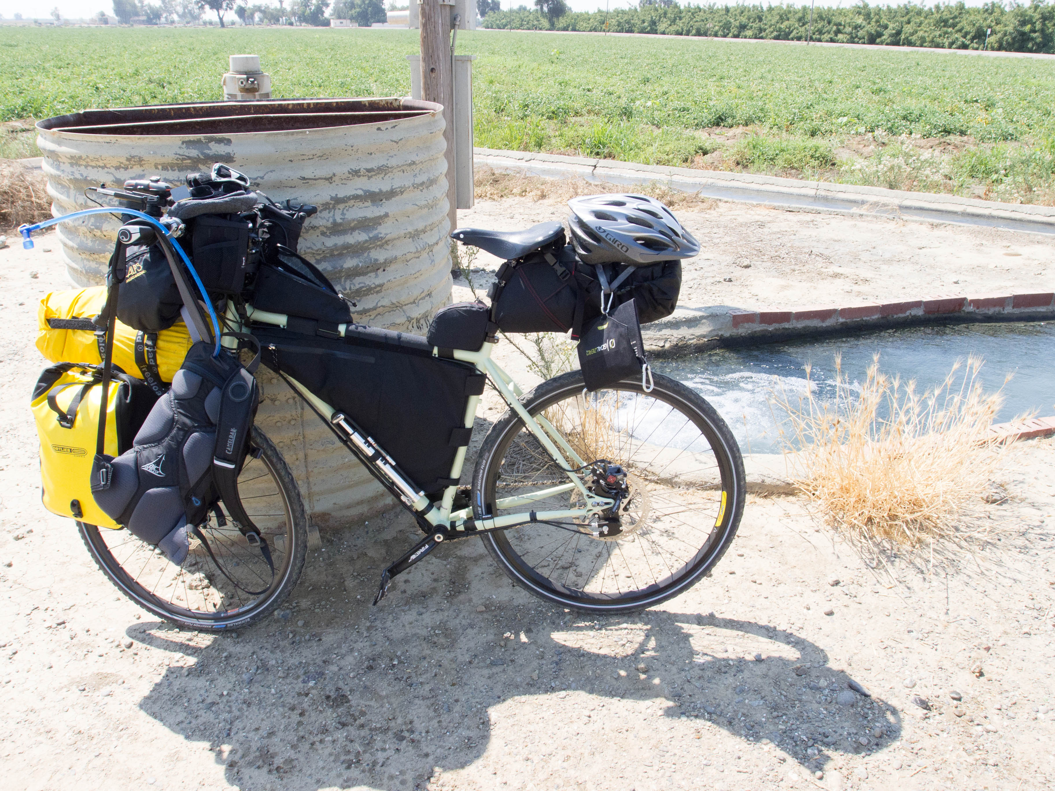 The riding was nice and flat. Perhaps one day I’ll be more inclined to be excited (in a good way) about hills but for the time being I’m loving the flatlands. This whole area is strewn with water canals. Some the size of small rivers and others just a roadside ditch. With all the work being done in the fields I was a sweat soaked muddy mess. I made use of one of the smaller canals to strip my shirt off and get it and me cleaned up a bit…musta been a helluva sight for anyone unlucky enough to pass by.